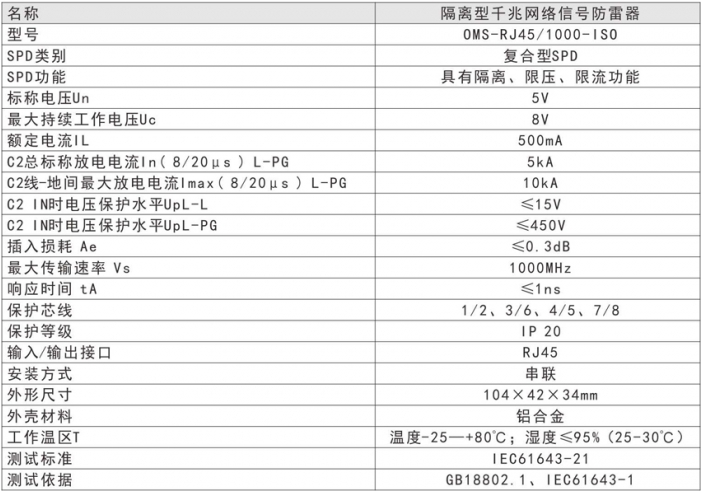 隔離型千兆網(wǎng)絡(luò)防雷器(1000M網(wǎng)絡(luò)電涌保護(hù)器、網(wǎng)絡(luò)避雷器) OMS-RJ45/1000-ISO-