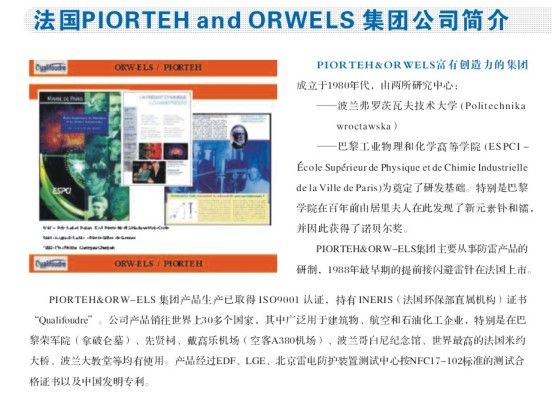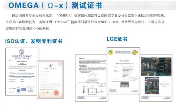 OMEGA:Ω-X提前放電避雷針由法國PIORTEH & WRWELS集團公司研制,公司已取得ISO9001認證,持有INERIS(法國環(huán)保直屬機構)證書,公司產品銷住世界30多個國家和地區(qū),廣泛用于建筑物、航空、和石化企業(yè),如:巴黎榮軍院(拿破侖墓)、先賢祠、戴高爾機場、波蘭哥白尼紀念館、世界最高的法國米約大橋、波蘭大教等名建筑中均有使用。產品已通過EDFLGE、北京雷電防護裝置測試中心的檢測報告和中國發(fā)明專利,產品由太平洋保險公司承保。