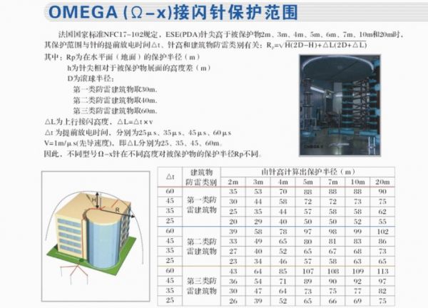 根據法國國家標準NFC17102規(guī)定,ESE(“提前接閃”的英文縮寫)針尖高于被保護物2m、4m5m、6m、7m10m20m時,其保護范圍與避雷針的提前放電時間T、針高和建筑物的防雷類別有關:
