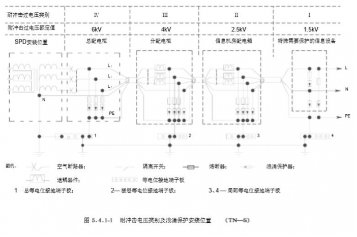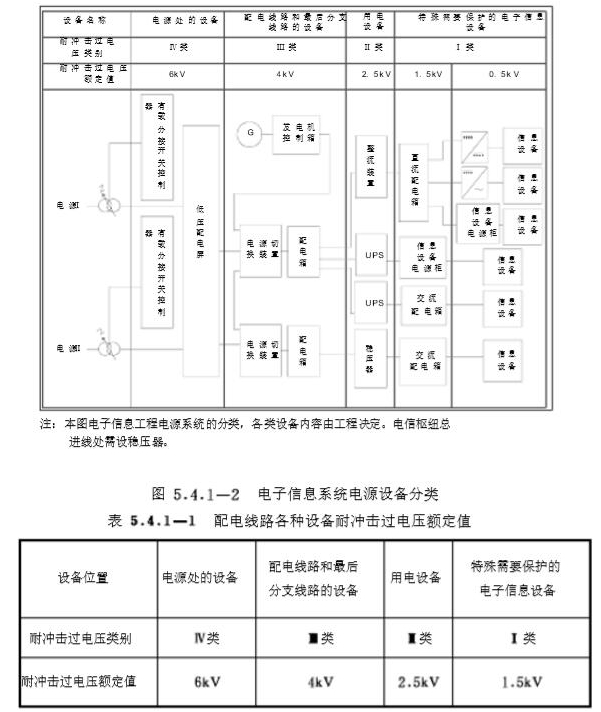 3.配電線路設備的耐沖擊過電壓額定值應符合表 5.4.1-1規(guī)定. 電子信息系統(tǒng)設備配電線路浪涌保護器安裝位置及電子信息系統(tǒng)電源設備分類示意如圖5.4.1-1和圖5.4.1-2所示。