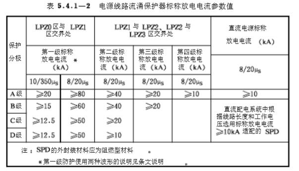 7.用于電源線路的浪涌保護器標稱放電電流參數值宜符合表5.4.1-2規(guī)定。